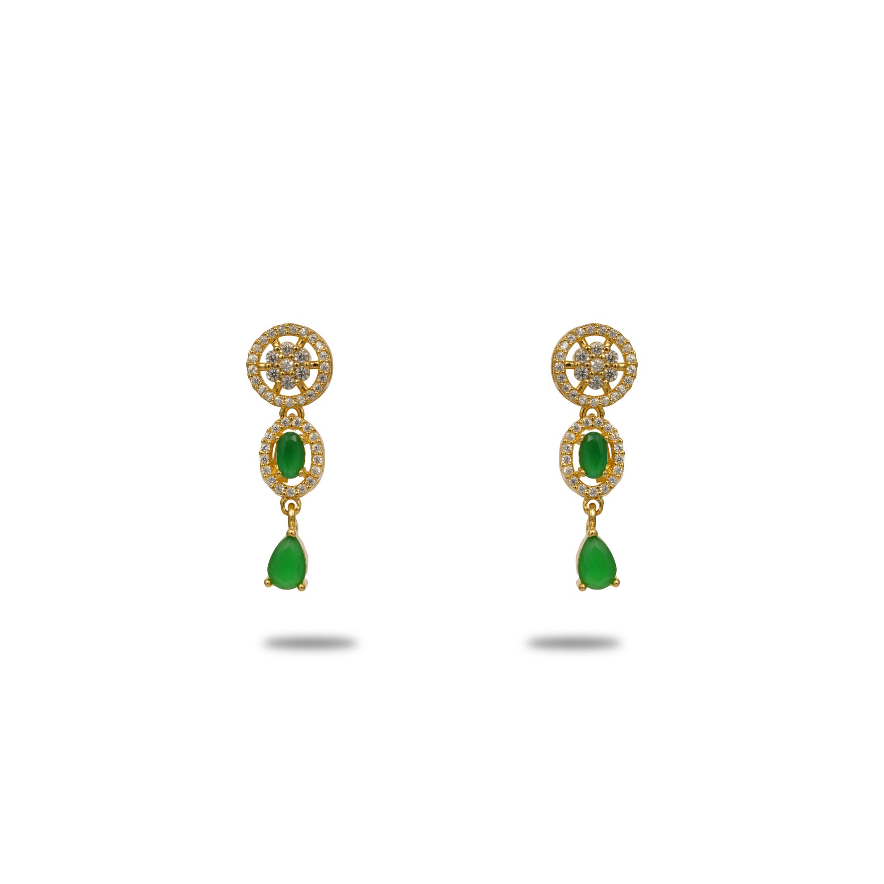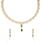 A beautifully balanced necklace set featuring a refined central highlight with subtle suspended brilliance. The intricate craftsmanship enhances its elegant silhouette. Finished in a warm gold tone that elevates its luxurious charm. Matching earrings add symmetry and grace. Designed for festive sophistication.