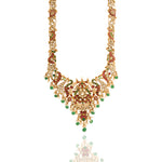 A luxurious blend of red and white stones intricately arranged across a gold-polished frame. Green stone hangings create a beautiful color harmony that enhances its festive charm. Traditional motifs are infused with a contemporary layered layout. The precision of stone setting reflects fine craftsmanship. A vibrant yet elegant statement piece.